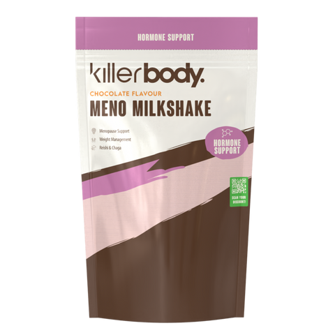 De Meno MealShake van Killerbody is ontwikkeld als volwaardige maaltijd met plantaardige eiwitten (erwten en soja), vezels, magnesium, zink, vitamine B6 en natuurlijke plantenextracten zoals ashwagandha, reishi en chaga.